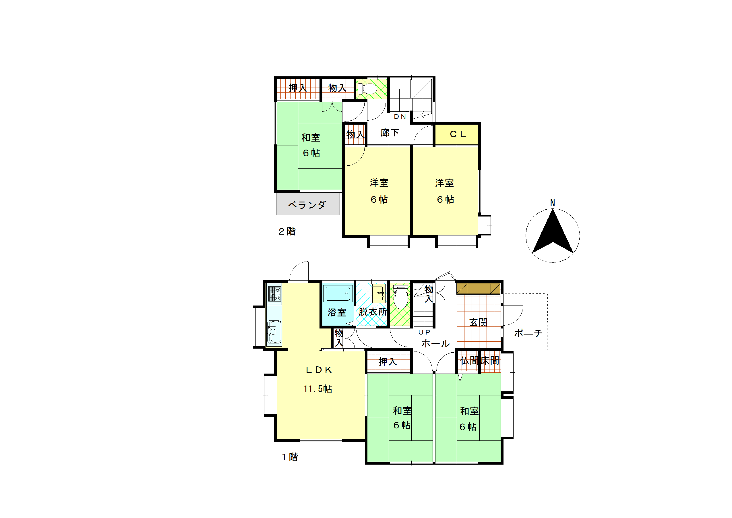| 間取内容 | 1階LDK11.5畳1室 1階和室6畳2室 2階和室6畳1室 2階洋室6畳2室 |