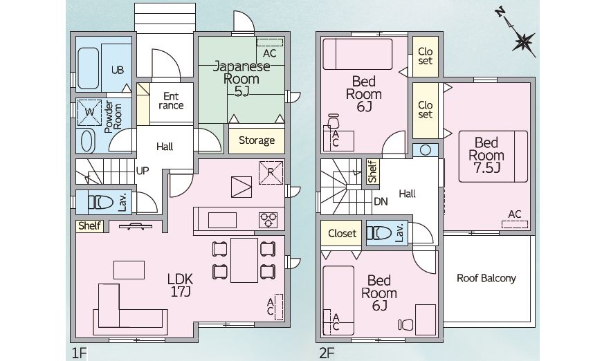| 間取内容 | 1階LDK17畳1室 1階和室5畳1室 2階洋室7.5畳1室 2階洋室6畳2室 |